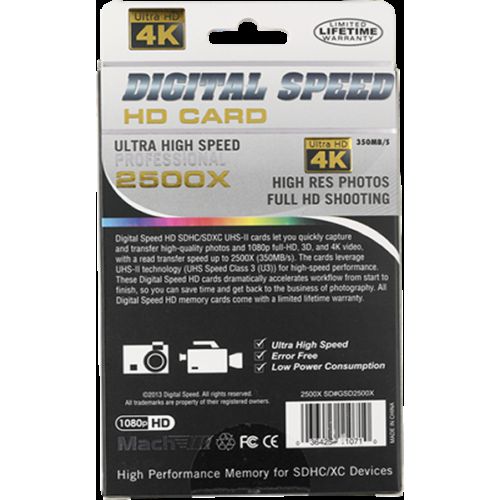 Capture Full HD, 3D, and 4K content with the Digital Speed 2500X 256GB Professional High Speed Mach III 350MB/s Error Free (SDHC) HD Memory Card Class 10 Memory Card. Each of the included SDXC memory card meets the UHS Speed Class 10 specification with maximum data speed of 350 MB/s. While this card is designed to meet the needs of those requiring enhanced data transfer rates, it remains backwards compatible with devices requiring UHS-II, Class 10 memory cards.